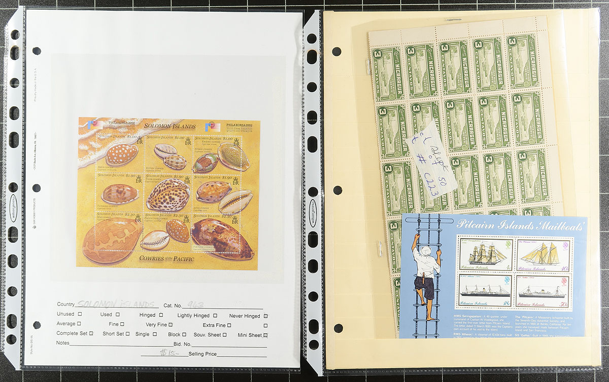 Souvenir Sheet Lovers (Part 2): This collector bought souvenir sheets from almost everywhere and put them on stockpages in page protectors. Mint (mostly never hinged) and a few used. Some were individual lots on local bidboards. Some are in window envelopes (and some of these have multiple sheets that we can’t see!). No Canada, USA or Western Europe, but everywhere else is here, with many great topicals. No organization, so no two pages are related. Fills a 2.5" binder. We note Brazil 1983 International Stamp Show, Chad 1977 Viking Spaceship (#C222 sheetlets), a couple of 1999 Georgia Europa panes, which alone catalogue almost US$500.00 plus lots of $5-$20 items, with a few stamps when they are part of the set. Estimate =