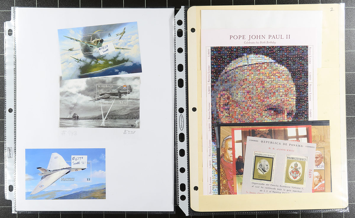 Souvenir Sheet Lovers (Part 3): This collector bought souvenir sheets from almost everywhere and put them on stockpages in page protectors. Mint (mostly never hinged) and a few used. Some were individual lots on local bidboards. Some are in window envelopes (and some of these have multiple sheets that we can’t see!). No Canada, USA or Western Europe, but everywhere else is here, with many great topicals. No organization, so no two pages are related. Fills a 2.5" binder. We note the "Monarchs of the Millennium" series plus lots of $5-$20 items, with a few stamps when they are part of the set. Estimate =