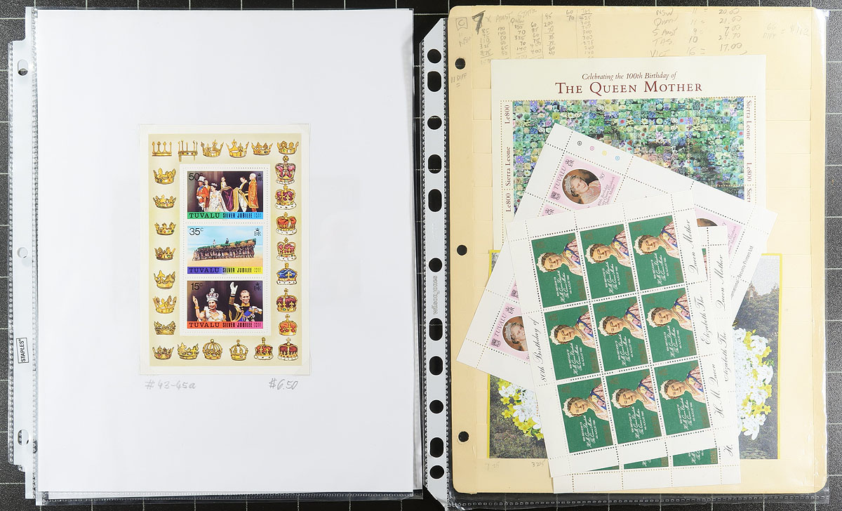 Souvenir Sheet Lovers (Part 3): This collector bought souvenir sheets from almost everywhere and put them on stockpages in page protectors. Mint (mostly never hinged) and a few used. Some were individual lots on local bidboards. Some are in window envelopes (and some of these have multiple sheets that we can’t see!). No Canada, USA or Western Europe, but everywhere else is here, with many great topicals. No organization, so no two pages are related. Fills a 2.5" binder. We note the "Monarchs of the Millennium" series plus lots of $5-$20 items, with a few stamps when they are part of the set. Estimate =