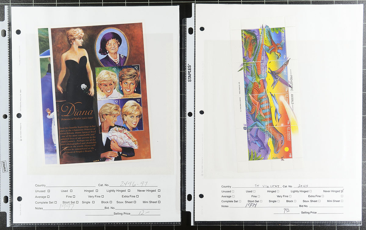 Souvenir Sheet Lovers (Part 4): This collector bought souvenir sheets from almost everywhere and put them on stockpages in page protectors. Mint (mostly never hinged) and a few used. Some were individual lots on local bidboards. Some are in window envelopes (and some of these have multiple sheets that we can’t see!). No Canada, USA or Western Europe, but everywhere else is here, with many great topicals. No organization, so no two pages are related. Fills a 2.5" binder. We note a nice batch of used Korea plus lots of $5-$20 items, with a few stamps when they are part of the set. Estimate =