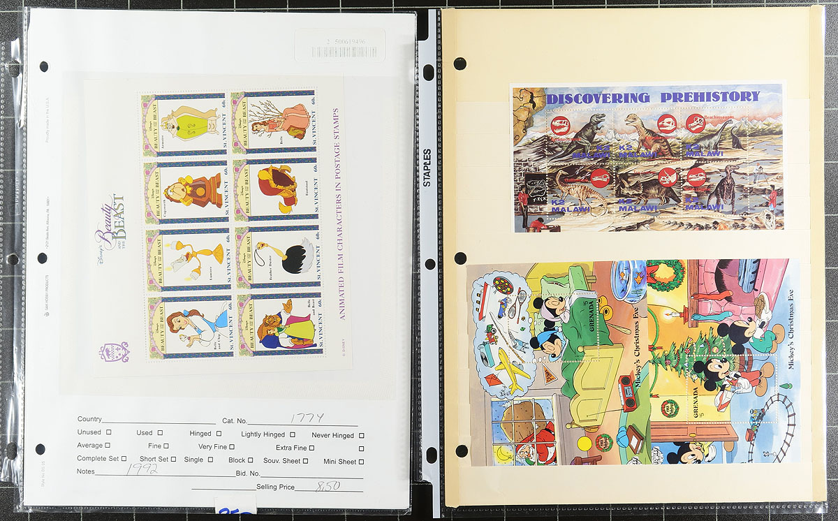 Souvenir Sheet Lovers (Part 4): This collector bought souvenir sheets from almost everywhere and put them on stockpages in page protectors. Mint (mostly never hinged) and a few used. Some were individual lots on local bidboards. Some are in window envelopes (and some of these have multiple sheets that we can’t see!). No Canada, USA or Western Europe, but everywhere else is here, with many great topicals. No organization, so no two pages are related. Fills a 2.5" binder. We note a nice batch of used Korea plus lots of $5-$20 items, with a few stamps when they are part of the set. Estimate =