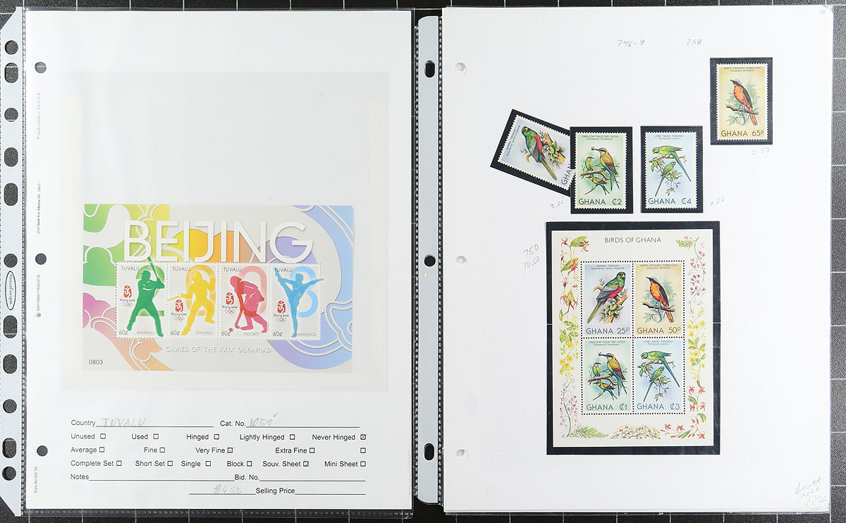Souvenir Sheet Lovers (Part 4): This collector bought souvenir sheets from almost everywhere and put them on stockpages in page protectors. Mint (mostly never hinged) and a few used. Some were individual lots on local bidboards. Some are in window envelopes (and some of these have multiple sheets that we can’t see!). No Canada, USA or Western Europe, but everywhere else is here, with many great topicals. No organization, so no two pages are related. Fills a 2.5" binder. We note a nice batch of used Korea plus lots of $5-$20 items, with a few stamps when they are part of the set. Estimate =