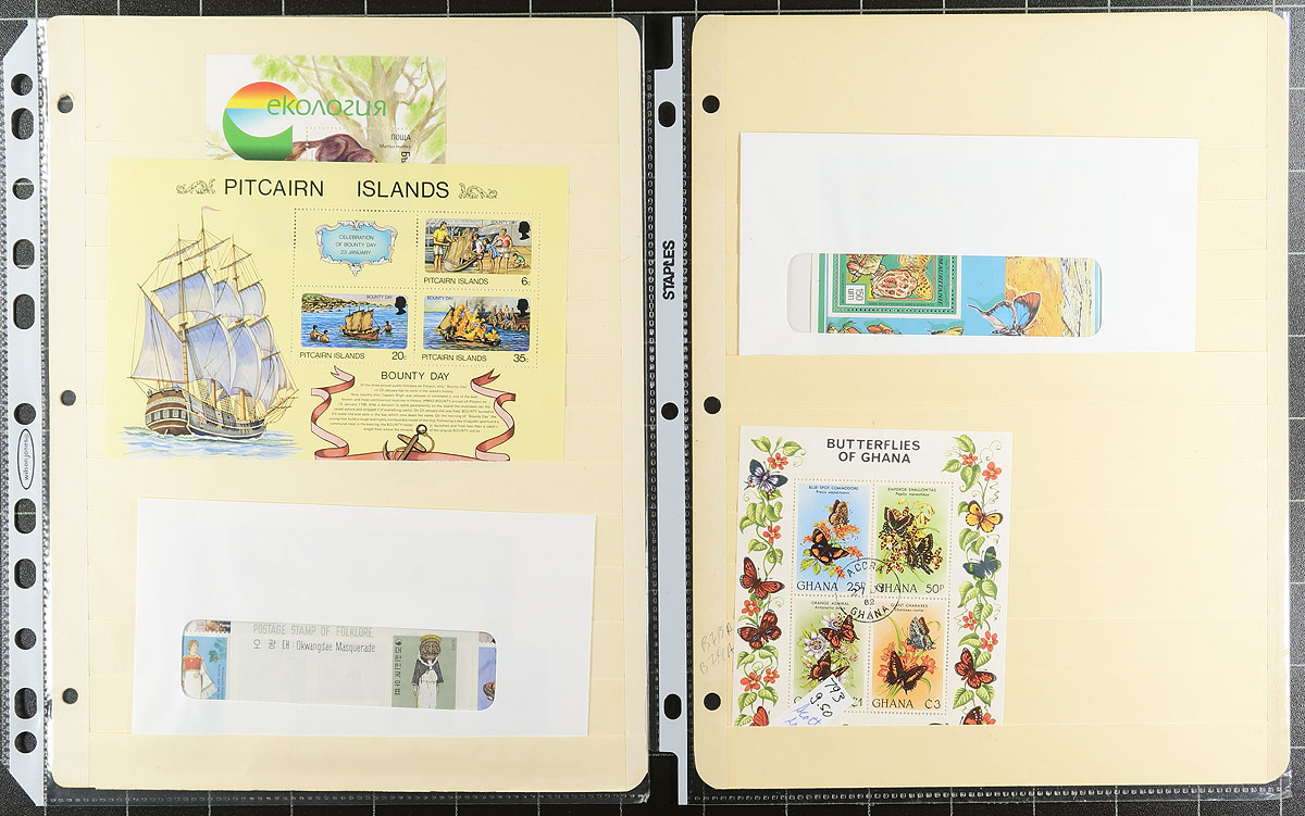 Souvenir Sheet Lovers (Part 4): This collector bought souvenir sheets from almost everywhere and put them on stockpages in page protectors. Mint (mostly never hinged) and a few used. Some were individual lots on local bidboards. Some are in window envelopes (and some of these have multiple sheets that we can’t see!). No Canada, USA or Western Europe, but everywhere else is here, with many great topicals. No organization, so no two pages are related. Fills a 2.5" binder. We note a nice batch of used Korea plus lots of $5-$20 items, with a few stamps when they are part of the set. Estimate =