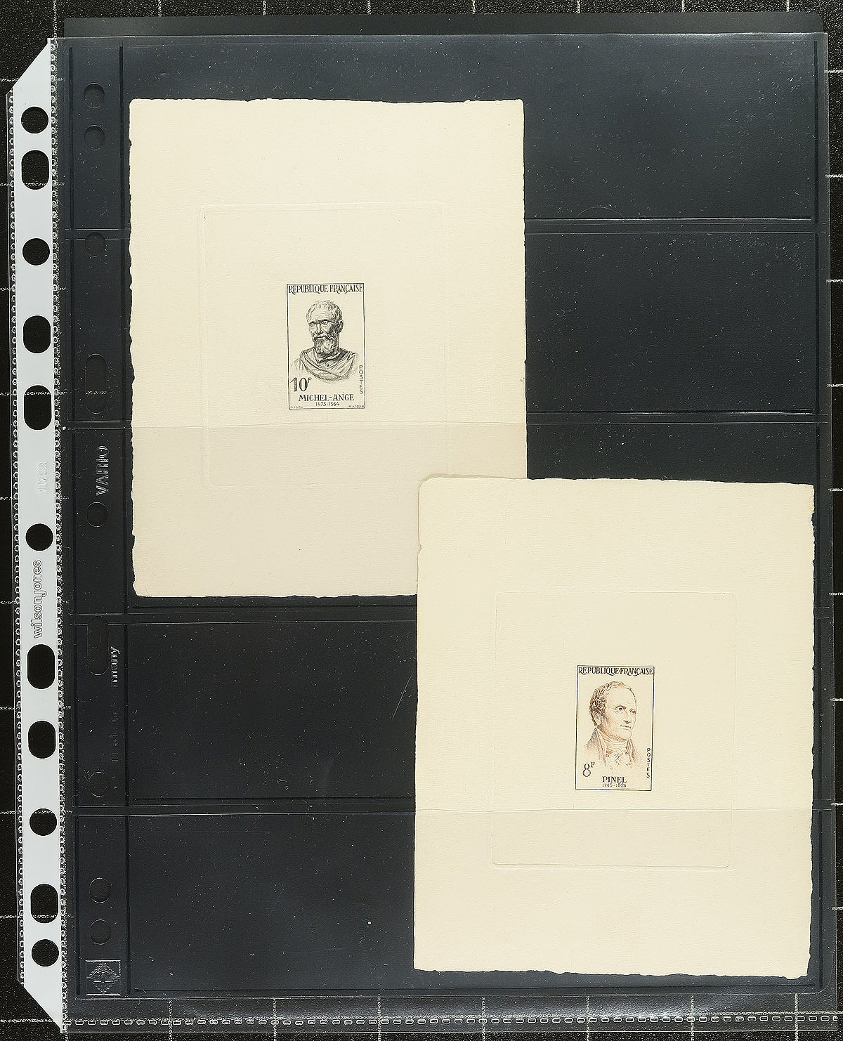 Die Proof holding. The French includes 1957 Michaelangelo and 1958 Pinel artists’ die proofs, followed by 1981 imperforate 1981 Europa corner duo, plus about 20 slightly duplicated group of Poste-France black proof cards (1982-1993). There is a strong finishing with six different "Deluxe Proofs" of the 1963 Human Rights anniversary issue from various French Colonies - few sets of these were ever produced. All in excellent condition. Estimate =