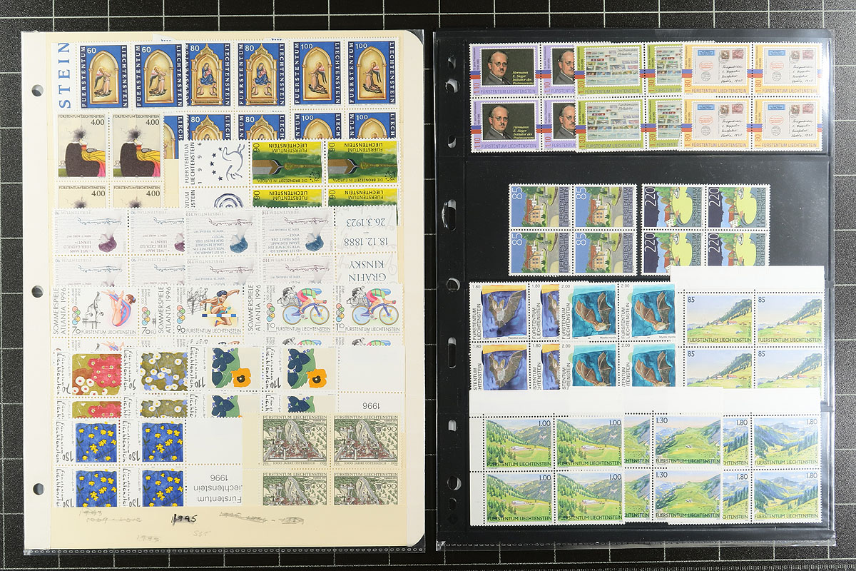 Six pages of mint blocks for an assortment of issues from 1996-2005, all never hinged. Enormous original face value (for modern Liechtenstein, the face value is close to the US catalogue value). Some topical appeal here and didn’t notice any duplication. Owner’s 2021 Scott US$659.80 =