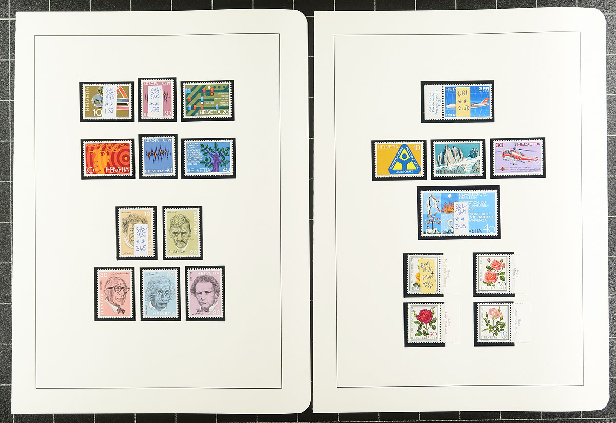 Accumulation of assorted mint Swiss issues from the 1890's to about 1980. Has better, such as two copies of the 1 franc high value of the 1932 Disarmament Conference (one is never hinged), some Standing Helvetia, 1900 UPU, a good range of 1966-1980 on pages and a bit of back of the book. As this is from several sources, expect a bit of duplication. A quick look indicates that the condition is quite good. Owner’s recent Scott catalogue value is over US$700.00. Estimate =