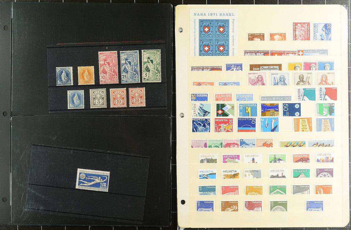 Accumulation of assorted mint Swiss issues from the 1890's to about 1980. Has better, such as two copies of the 1 franc high value of the 1932 Disarmament Conference (one is never hinged), some Standing Helvetia, 1900 UPU, a good range of 1966-1980 on pages and a bit of back of the book. As this is from several sources, expect a bit of duplication. A quick look indicates that the condition is quite good. Owner’s recent Scott catalogue value is over US$700.00. Estimate =