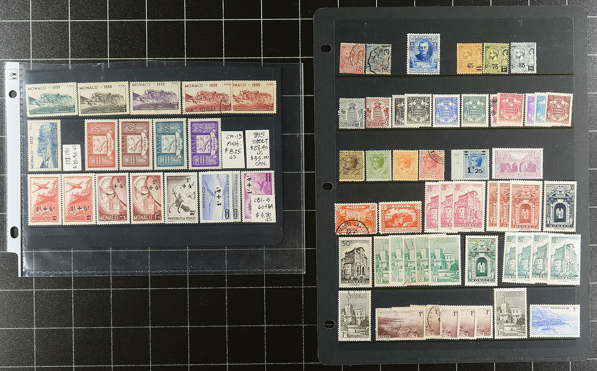 A mess of Monaco, with some early used such as #3, #4, #6, #15, #20, #27, #128, #129, with a mix of mid-century mint and used and then ending with five pages’ worth of mint, never hinged panes of 10 (minor duplication). A couple of faults in the earlier issues with the modern issues being near perfect. Owner’s 2023 Scott US$872.65 =