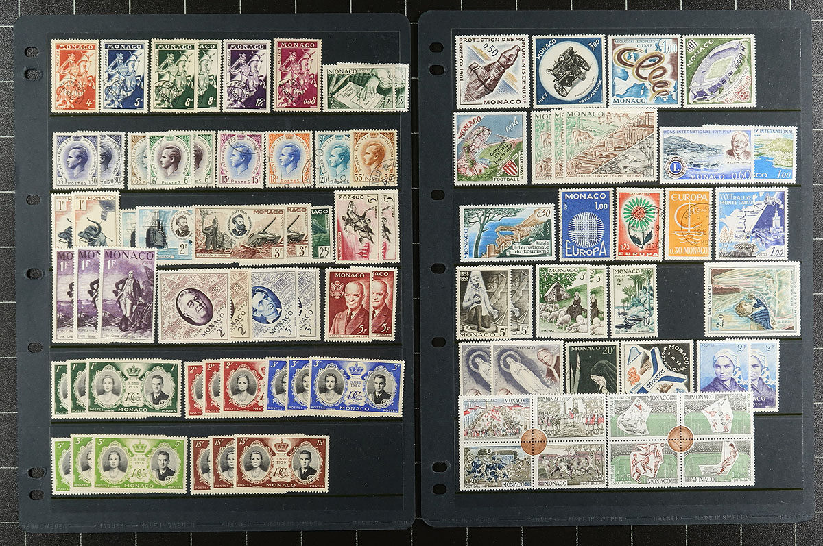 A mess of Monaco, with some early used such as #3, #4, #6, #15, #20, #27, #128, #129, with a mix of mid-century mint and used and then ending with five pages’ worth of mint, never hinged panes of 10 (minor duplication). A couple of faults in the earlier issues with the modern issues being near perfect. Owner’s 2023 Scott US$872.65 =
