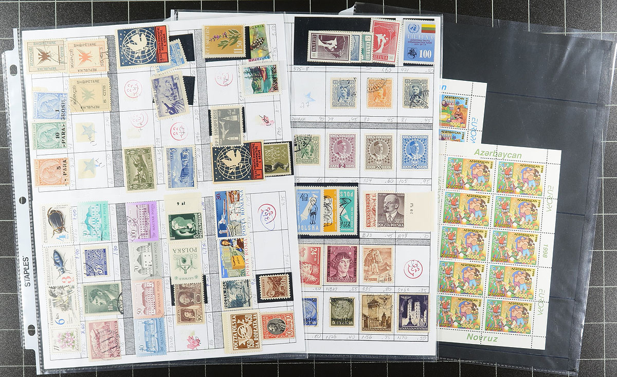 Eastern European bundle, mostly an assortment of former bidboard lots, with individual items or countries and a few multi-country groups on stockpages. In no particular order, there is a block of 21 of Serbia #51b, a couple of pages of Albania, late 1990's Europa sheetlets from Armenia and Azerbaijan, as well as selections from Albania, Bosnia, Bulgaria, Czechoslovakia, Hungary, Poland, Russia, Ukraine, Estonia, Latvia, Lithuania, Romania, and more. The group concludes with a mint sheet file with mint panes of Croatia floral "triangles", not counted in the owner’s catalogue value. Owner's 2022 Scott catalogue value US$1208.05 =