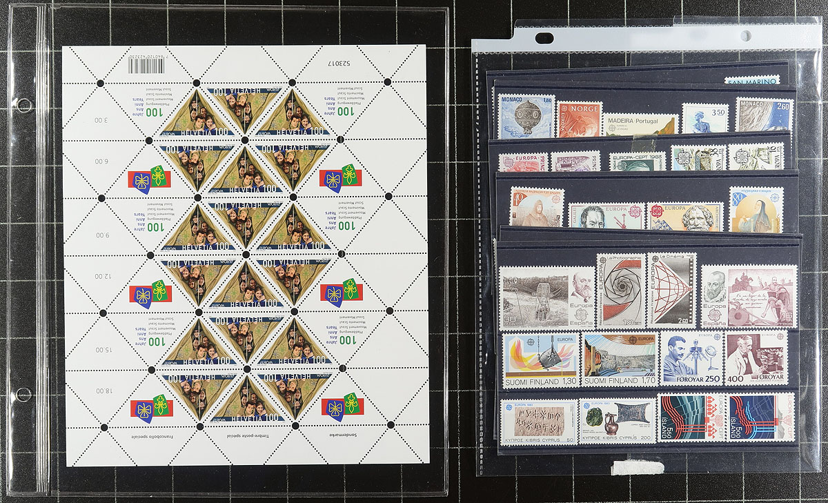 "Europa" issues, an assortment from 1956, 1965, 1973, 1974 and 1983. Most are never hinged, from a range of Western European states, which catalogue about US$900.00. A couple of bonus items are the key Andorra (Spain) 1972 issue, with some minor gum thins plus the hingeless "SAFE" pages for the 1973-74. A popular omnibus and common design issue. Estimate =