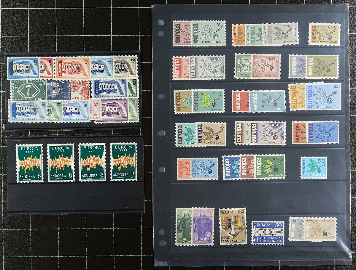"Europa" issues, an assortment from 1956, 1965, 1973, 1974 and 1983. Most are never hinged, from a range of Western European states, which catalogue about US$900.00. A couple of bonus items are the key Andorra (Spain) 1972 issue, with some minor gum thins plus the hingeless "SAFE" pages for the 1973-74. A popular omnibus and common design issue. Estimate =