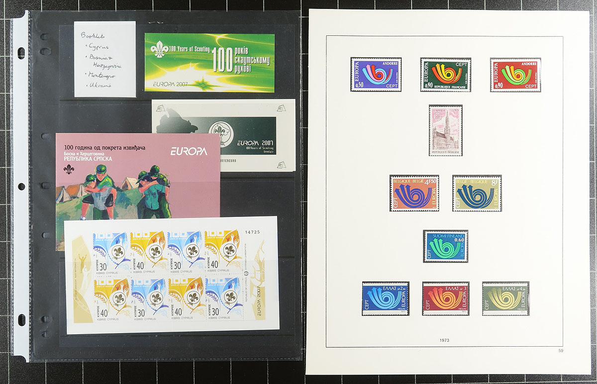 "Europa" issues, an assortment from 1956, 1965, 1973, 1974 and 1983. Most are never hinged, from a range of Western European states, which catalogue about US$900.00. A couple of bonus items are the key Andorra (Spain) 1972 issue, with some minor gum thins plus the hingeless "SAFE" pages for the 1973-74. A popular omnibus and common design issue. Estimate =