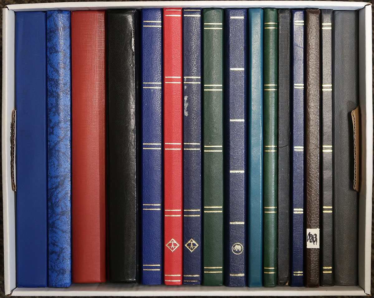 Box of 16 used stockbooks. Various brands, sizes, cover and page colours. 8 are 16-page, 7 are 32-page and there is one 48-pager. Great to hold your collection, duplicates or to mount for sale. A couple of small cover flaws, but generally nice. Their modern equivalent retail is on the march and exceeds $500.00! Estimate =