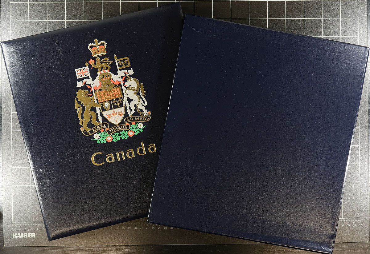 Modern Deluxe Album Duo (with Stamps). Two high quality "as new" Hingeless Canada albums with matching slipcases. The first is a DAVO album (Volume IV) covering the period 2001 to 2006 containing 168 MNH and used stamps and 17 souvenir sheets. The second album is a Stanley Gibbons Volume V (identical to DAVO) covering the period 2007 to 2012, sparsely populated with 7 stamps and 7 souvenir sheets. These albums retail new for over $700.00! Here's your chance to get these popular albums, partially pre-filled with a substantial quantity of material. The other volumes of these albums are readily available from most dealers. Estimate =