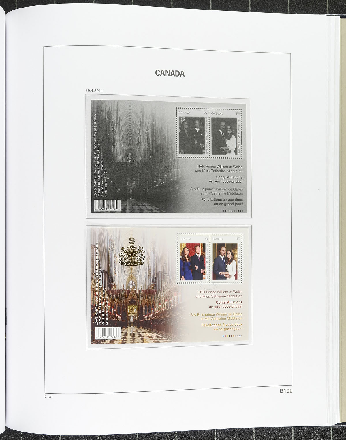 Modern Deluxe Album Duo (with Stamps). Two high quality "as new" Hingeless Canada albums with matching slipcases. The first is a DAVO album (Volume IV) covering the period 2001 to 2006 containing 168 MNH and used stamps and 17 souvenir sheets. The second album is a Stanley Gibbons Volume V (identical to DAVO) covering the period 2007 to 2012, sparsely populated with 7 stamps and 7 souvenir sheets. These albums retail new for over $700.00! Here's your chance to get these popular albums, partially pre-filled with a substantial quantity of material. The other volumes of these albums are readily available from most dealers. Estimate =