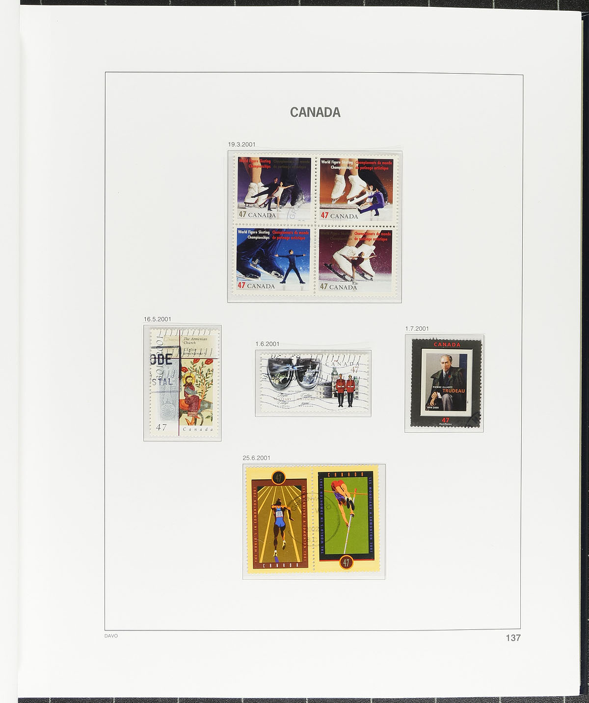 Modern Deluxe Album Duo (with Stamps). Two high quality "as new" Hingeless Canada albums with matching slipcases. The first is a DAVO album (Volume IV) covering the period 2001 to 2006 containing 168 MNH and used stamps and 17 souvenir sheets. The second album is a Stanley Gibbons Volume V (identical to DAVO) covering the period 2007 to 2012, sparsely populated with 7 stamps and 7 souvenir sheets. These albums retail new for over $700.00! Here's your chance to get these popular albums, partially pre-filled with a substantial quantity of material. The other volumes of these albums are readily available from most dealers. Estimate =