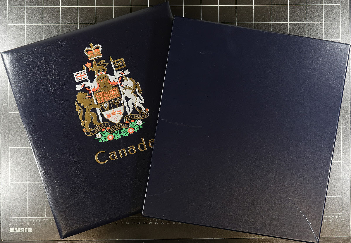 Modern Deluxe Album Duo (with Stamps). Two high quality "as new" Hingeless Canada albums with matching slipcases. The first is a DAVO album (Volume IV) covering the period 2001 to 2006 containing 168 MNH and used stamps and 17 souvenir sheets. The second album is a Stanley Gibbons Volume V (identical to DAVO) covering the period 2007 to 2012, sparsely populated with 7 stamps and 7 souvenir sheets. These albums retail new for over $700.00! Here's your chance to get these popular albums, partially pre-filled with a substantial quantity of material. The other volumes of these albums are readily available from most dealers. Estimate =
