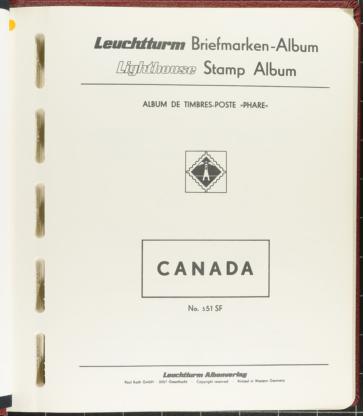 Brand new, but older style, Lighthouse hingeless album with pages 1851-1975 in a burgundy faux leather cover. There is no indication that stamps have ever graced these pages. The list price for pages (to 1971) & binder is over $500.00. Put the money you save on the album into more stamps to fill it! Minor soiling to cover might come off with a bit of TLC. Estimate =