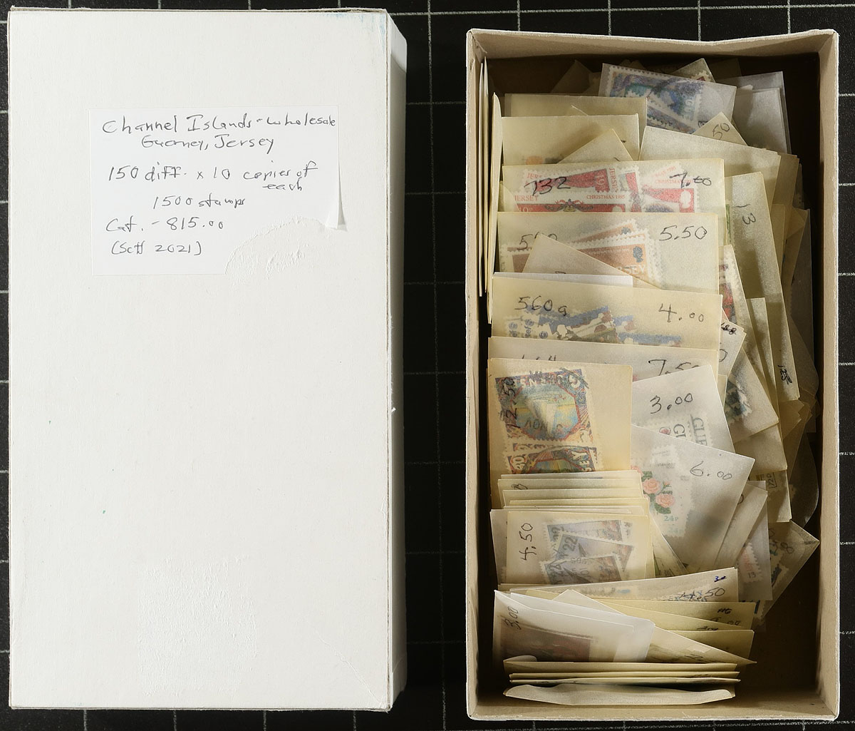 Bankers box of Worldwide delight. Almost every nook and cranny of this bankers box is filled. There is a 48-page stockbook with a used worldwide accumulation (probably a dozen countries including Canada, Australia, Germany with a better set of British Antarctica #39-42 etc.). There are at least three large groups of worldwide souvenir sheets (some on collector panels). A handful of material from philatelic shows, A New York World Fair topical collection, plus some used Channel Islands, baggies and envelope-sorted duplicates. Estimate =