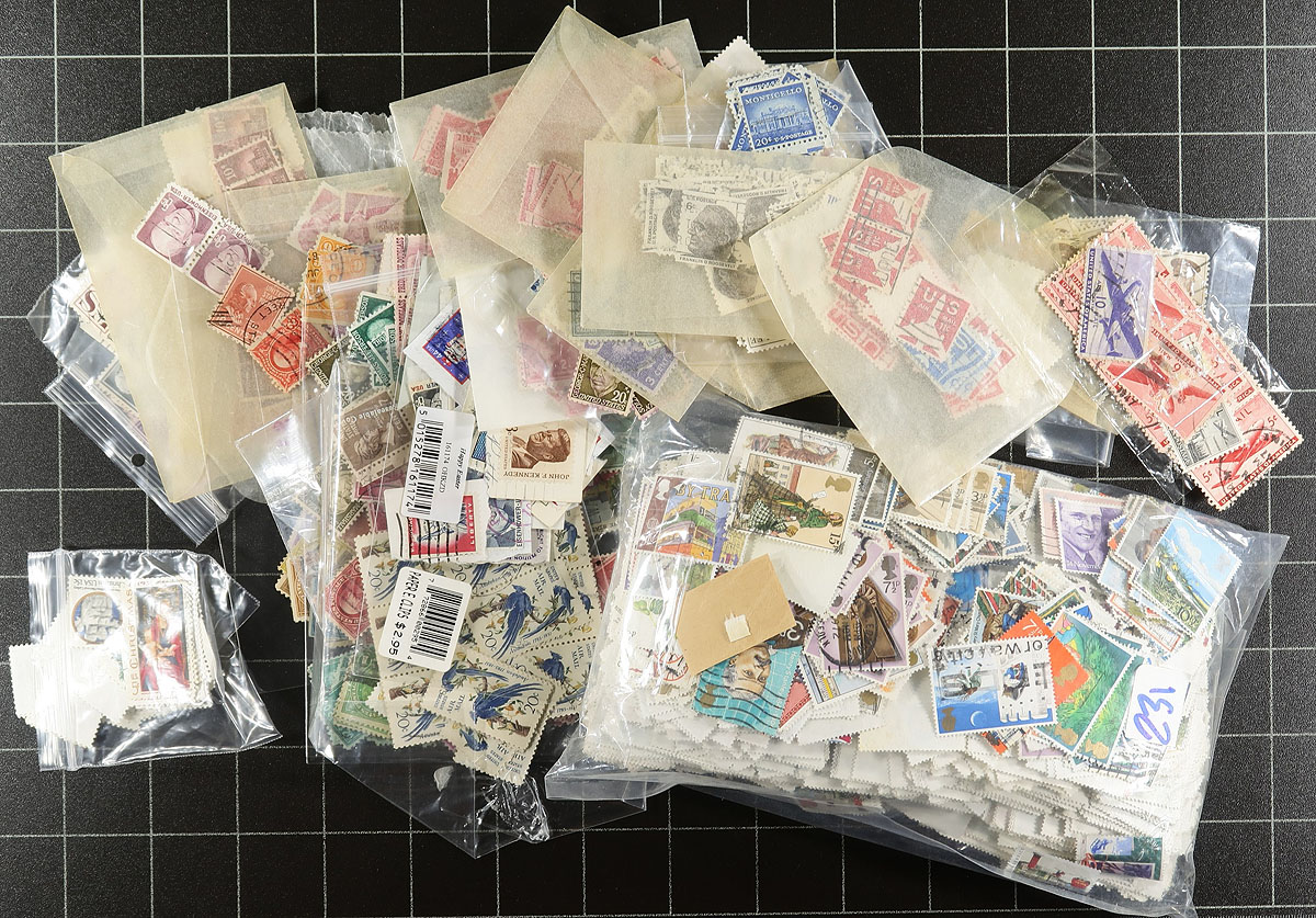 Bankers box of Worldwide delight. Almost every nook and cranny of this bankers box is filled. There is a 48-page stockbook with a used worldwide accumulation (probably a dozen countries including Canada, Australia, Germany with a better set of British Antarctica #39-42 etc.). There are at least three large groups of worldwide souvenir sheets (some on collector panels). A handful of material from philatelic shows, A New York World Fair topical collection, plus some used Channel Islands, baggies and envelope-sorted duplicates. Estimate =