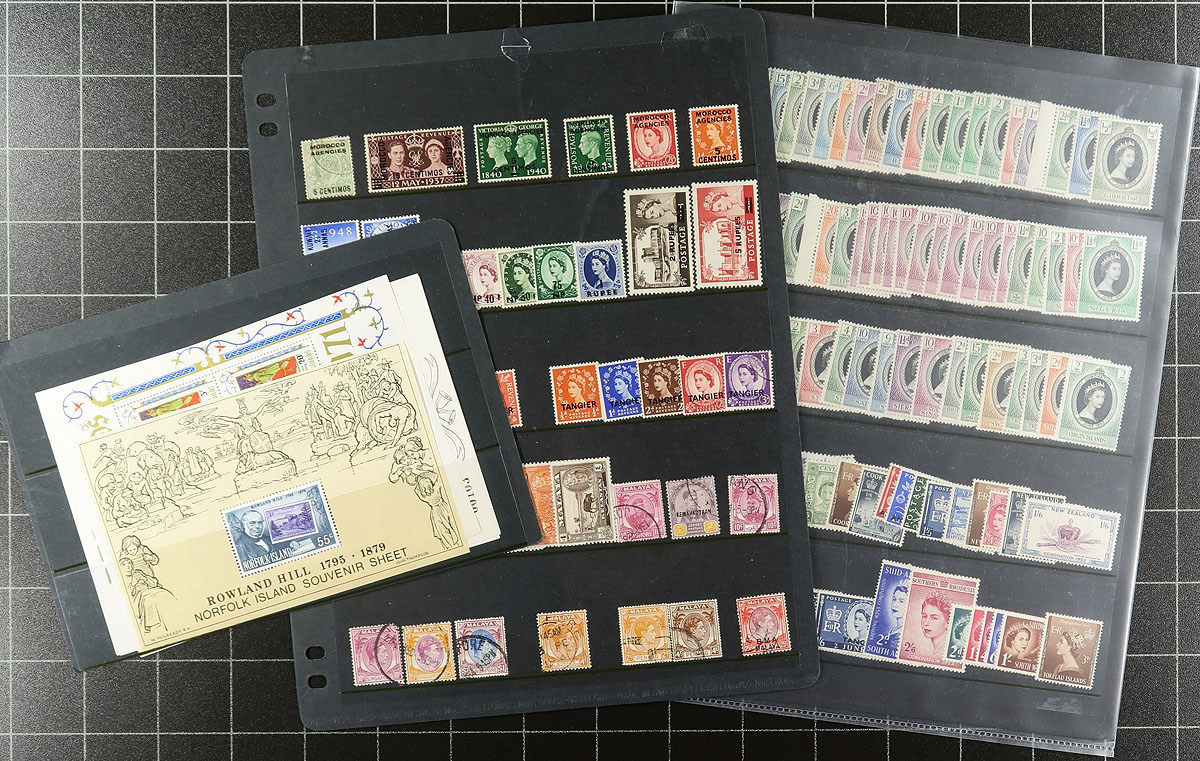 Estate balance #1. A bit from many different colonies, with strength from the Caribbean and Pacific. In order of appearance, there are some souvenir sheets, South Georgia, Tonga, Papua, 1953 Coronation, Turks and Caicos, Virgin Islands, Trinidad and Tobago, Barbuda (1993-1988), topicals, Falkland Islands, GB-Offices, Christmas Island, finishing with a stockbook of mint QEII with minor (but mostly SG-listed) varieties (e.g. inverted watermark). Estimate =
