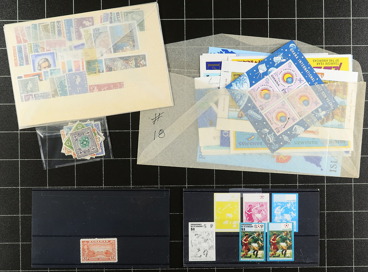 Estate balance #1. A bit from many different colonies, with strength from the Caribbean and Pacific. In order of appearance, there are some souvenir sheets, South Georgia, Tonga, Papua, 1953 Coronation, Turks and Caicos, Virgin Islands, Trinidad and Tobago, Barbuda (1993-1988), topicals, Falkland Islands, GB-Offices, Christmas Island, finishing with a stockbook of mint QEII with minor (but mostly SG-listed) varieties (e.g. inverted watermark). Estimate =