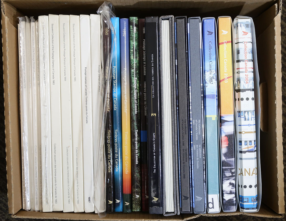 Box of Annual Collections a near-complete run from 1974-2004 plus a bonus of the "Millennium" collection. Yes, it has the good 1974 folder (unpunched) in far better condition than normally seen, but alas the collector put the stamps in poorly applied mounts. From that point, there is the 1977-1985, 1987-88, 1990-1994, 1996, 2000-2004 sets. Most have the stamps already in the mounts. Substantial original cost and over $350.00 face value. Estimate =