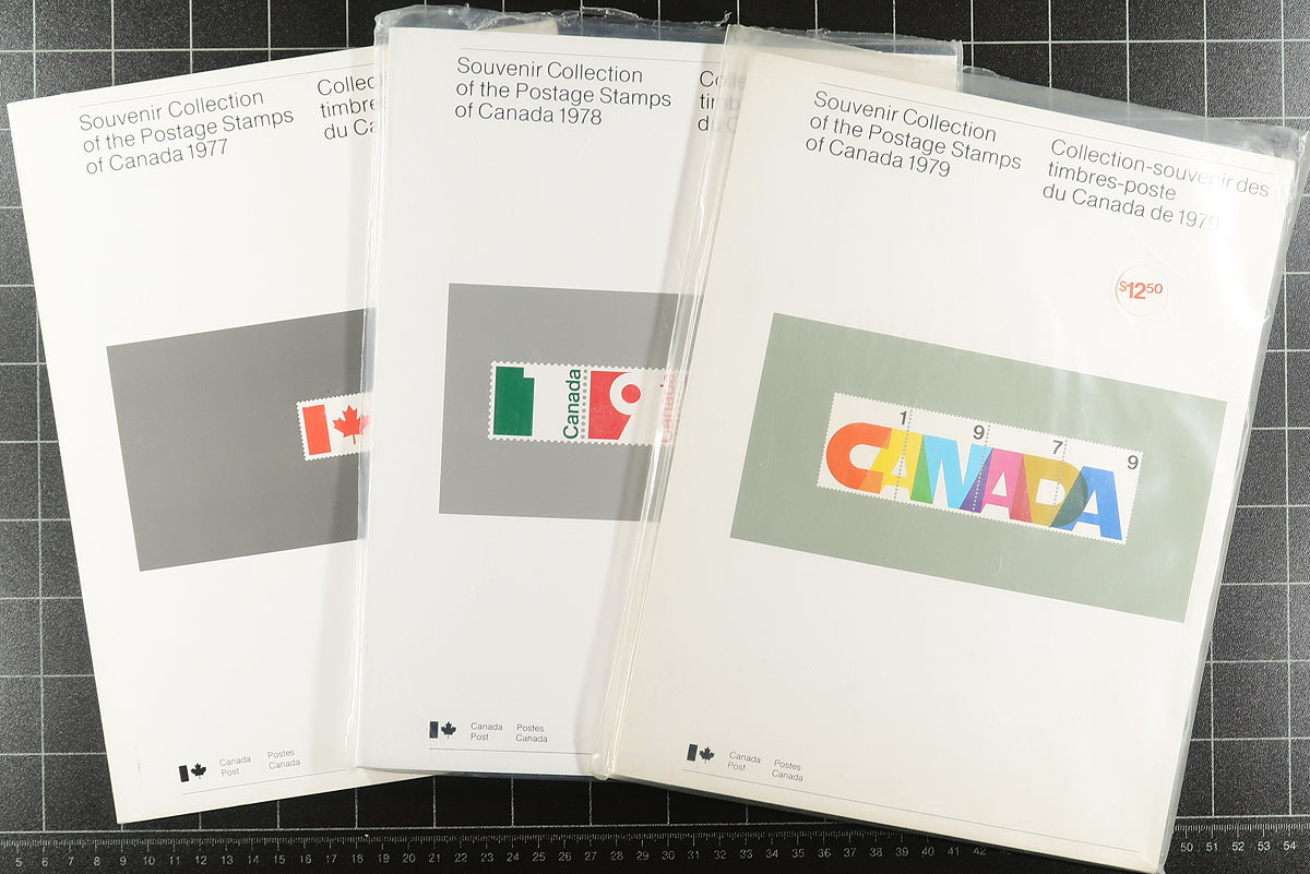 Box of Annual Collections a near-complete run from 1974-2004 plus a bonus of the "Millennium" collection. Yes, it has the good 1974 folder (unpunched) in far better condition than normally seen, but alas the collector put the stamps in poorly applied mounts. From that point, there is the 1977-1985, 1987-88, 1990-1994, 1996, 2000-2004 sets. Most have the stamps already in the mounts. Substantial original cost and over $350.00 face value. Estimate =