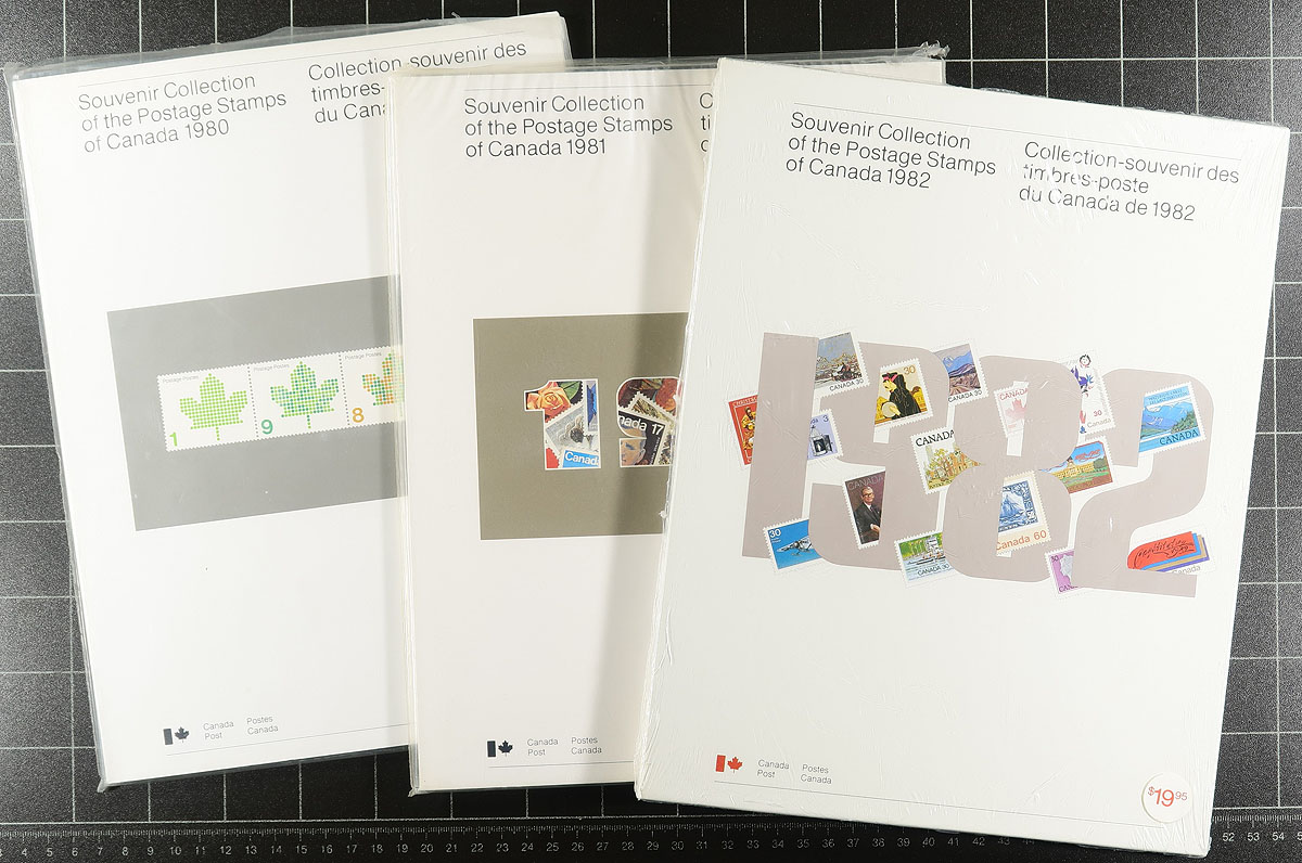 Box of Annual Collections a near-complete run from 1974-2004 plus a bonus of the "Millennium" collection. Yes, it has the good 1974 folder (unpunched) in far better condition than normally seen, but alas the collector put the stamps in poorly applied mounts. From that point, there is the 1977-1985, 1987-88, 1990-1994, 1996, 2000-2004 sets. Most have the stamps already in the mounts. Substantial original cost and over $350.00 face value. Estimate =