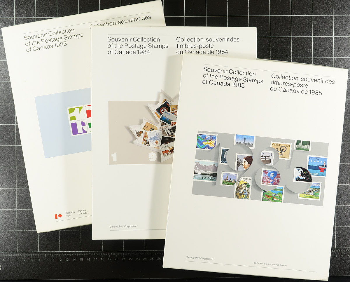 Box of Annual Collections a near-complete run from 1974-2004 plus a bonus of the "Millennium" collection. Yes, it has the good 1974 folder (unpunched) in far better condition than normally seen, but alas the collector put the stamps in poorly applied mounts. From that point, there is the 1977-1985, 1987-88, 1990-1994, 1996, 2000-2004 sets. Most have the stamps already in the mounts. Substantial original cost and over $350.00 face value. Estimate =