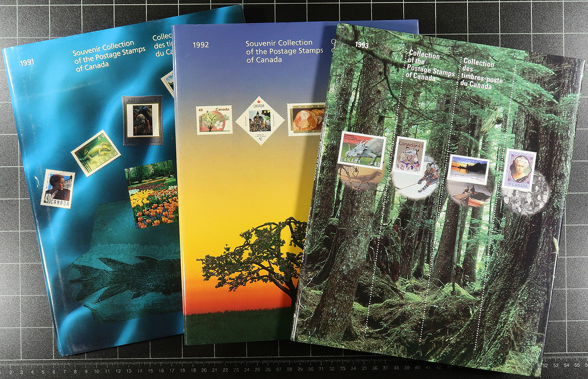 Box of Annual Collections a near-complete run from 1974-2004 plus a bonus of the "Millennium" collection. Yes, it has the good 1974 folder (unpunched) in far better condition than normally seen, but alas the collector put the stamps in poorly applied mounts. From that point, there is the 1977-1985, 1987-88, 1990-1994, 1996, 2000-2004 sets. Most have the stamps already in the mounts. Substantial original cost and over $350.00 face value. Estimate =