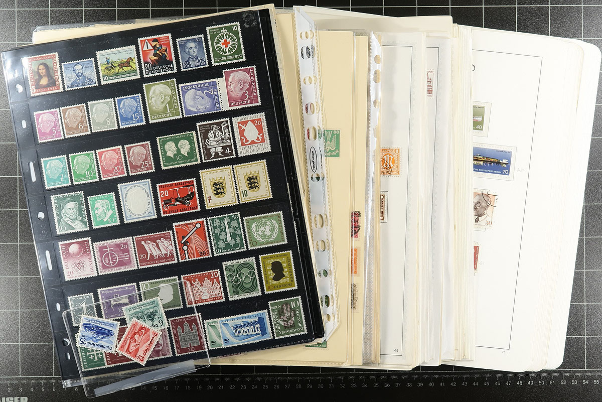 A big handful of album and stockpages of 20th century Germany. Some mint, some used, with material ranging from specialized to general. There is a group of Schaubek hingeless album pages for Berlin (1948-1954 and 1985-1990) and a Lighthouse section with pages for 1975-1982 (pages retail for $73.00, plus 336 stamps). Another couple of hundred stamps can be found in a post-WWII "French Zone" collection on Lighthouse hingeless pages (pages retail for $133.00). Then you get into two accumulations (one 1880's-1940's, other 1945-1980 and a page of mint 1952-1956). Value and fun in equal parts here. Estimate =