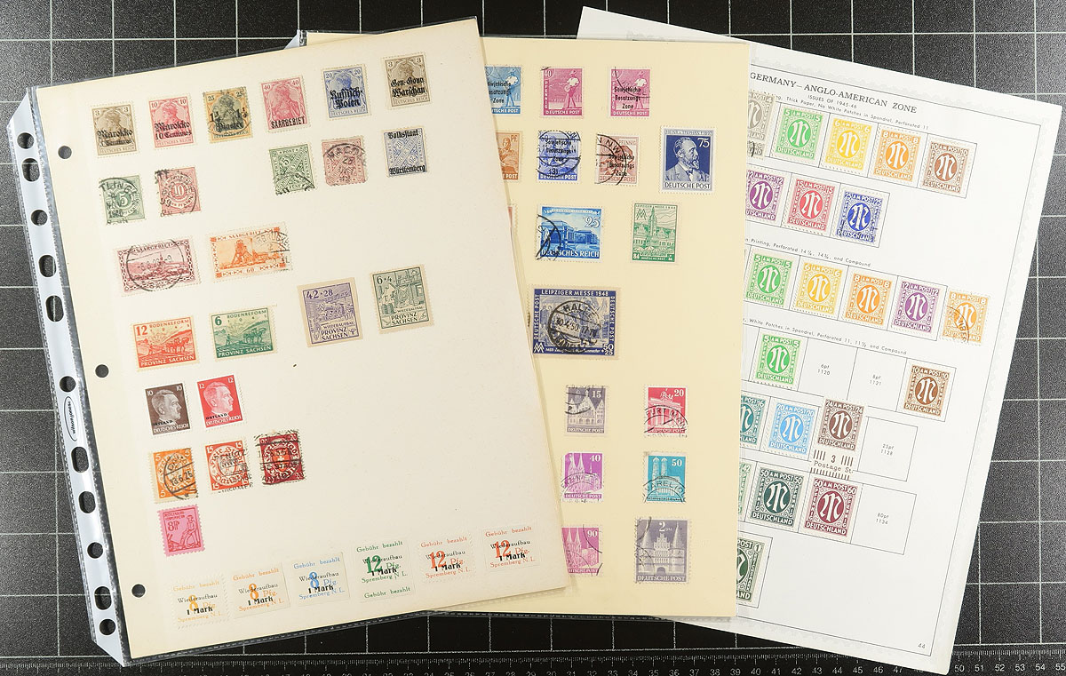 A big handful of album and stockpages of 20th century Germany. Some mint, some used, with material ranging from specialized to general. There is a group of Schaubek hingeless album pages for Berlin (1948-1954 and 1985-1990) and a Lighthouse section with pages for 1975-1982 (pages retail for $73.00, plus 336 stamps). Another couple of hundred stamps can be found in a post-WWII "French Zone" collection on Lighthouse hingeless pages (pages retail for $133.00). Then you get into two accumulations (one 1880's-1940's, other 1945-1980 and a page of mint 1952-1956). Value and fun in equal parts here. Estimate =