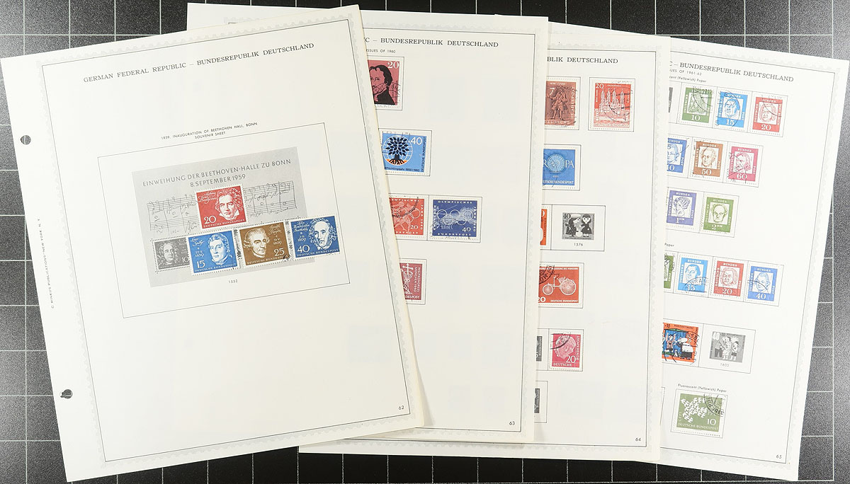 A big handful of album and stockpages of 20th century Germany. Some mint, some used, with material ranging from specialized to general. There is a group of Schaubek hingeless album pages for Berlin (1948-1954 and 1985-1990) and a Lighthouse section with pages for 1975-1982 (pages retail for $73.00, plus 336 stamps). Another couple of hundred stamps can be found in a post-WWII "French Zone" collection on Lighthouse hingeless pages (pages retail for $133.00). Then you get into two accumulations (one 1880's-1940's, other 1945-1980 and a page of mint 1952-1956). Value and fun in equal parts here. Estimate =