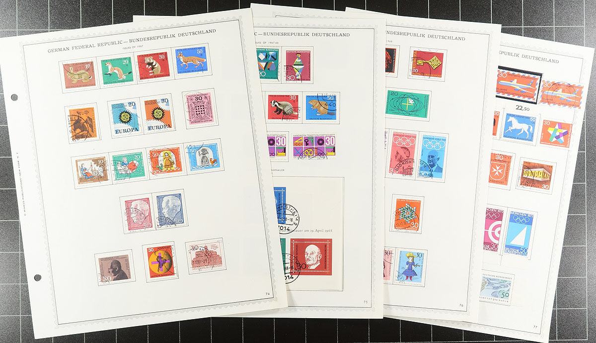 A big handful of album and stockpages of 20th century Germany. Some mint, some used, with material ranging from specialized to general. There is a group of Schaubek hingeless album pages for Berlin (1948-1954 and 1985-1990) and a Lighthouse section with pages for 1975-1982 (pages retail for $73.00, plus 336 stamps). Another couple of hundred stamps can be found in a post-WWII "French Zone" collection on Lighthouse hingeless pages (pages retail for $133.00). Then you get into two accumulations (one 1880's-1940's, other 1945-1980 and a page of mint 1952-1956). Value and fun in equal parts here. Estimate =