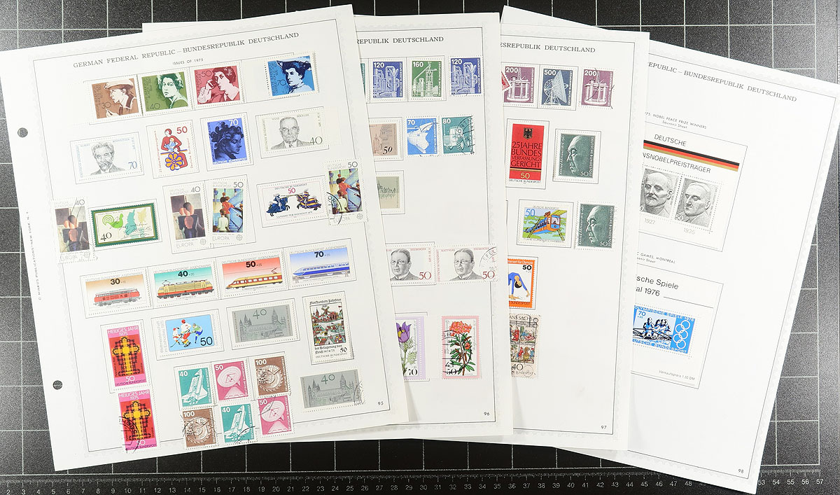 A big handful of album and stockpages of 20th century Germany. Some mint, some used, with material ranging from specialized to general. There is a group of Schaubek hingeless album pages for Berlin (1948-1954 and 1985-1990) and a Lighthouse section with pages for 1975-1982 (pages retail for $73.00, plus 336 stamps). Another couple of hundred stamps can be found in a post-WWII "French Zone" collection on Lighthouse hingeless pages (pages retail for $133.00). Then you get into two accumulations (one 1880's-1940's, other 1945-1980 and a page of mint 1952-1956). Value and fun in equal parts here. Estimate =