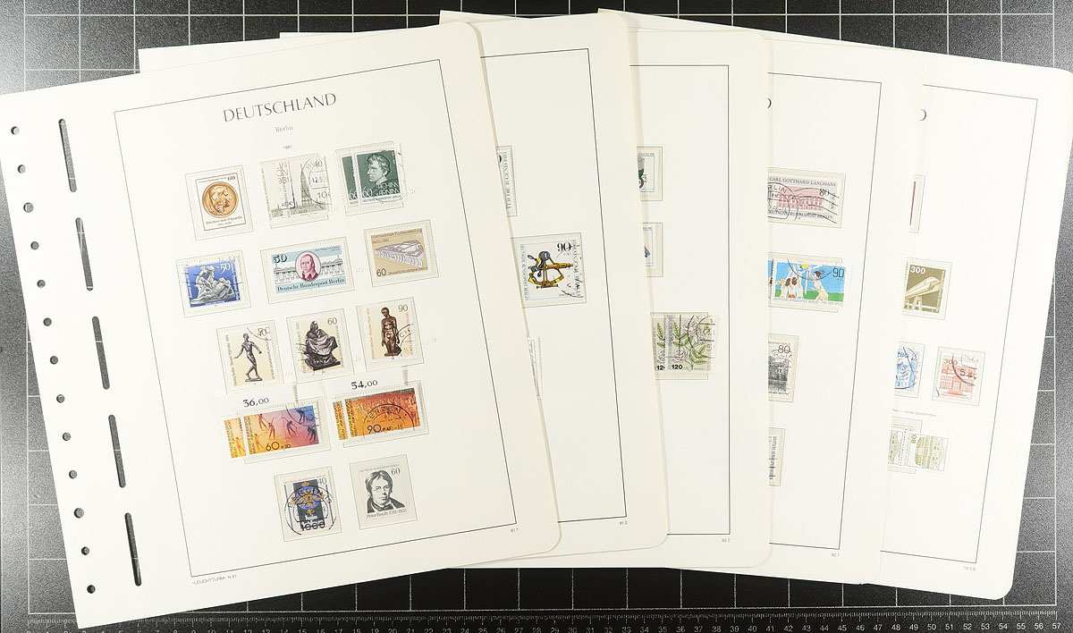 A big handful of album and stockpages of 20th century Germany. Some mint, some used, with material ranging from specialized to general. There is a group of Schaubek hingeless album pages for Berlin (1948-1954 and 1985-1990) and a Lighthouse section with pages for 1975-1982 (pages retail for $73.00, plus 336 stamps). Another couple of hundred stamps can be found in a post-WWII "French Zone" collection on Lighthouse hingeless pages (pages retail for $133.00). Then you get into two accumulations (one 1880's-1940's, other 1945-1980 and a page of mint 1952-1956). Value and fun in equal parts here. Estimate =