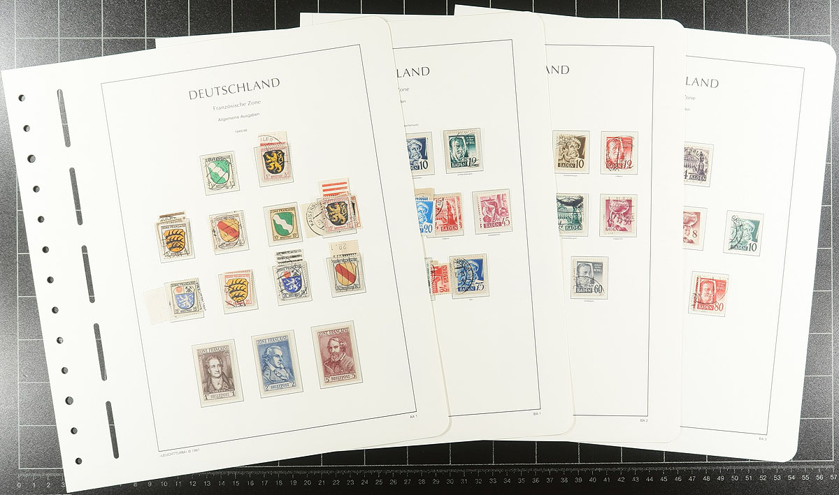 A big handful of album and stockpages of 20th century Germany. Some mint, some used, with material ranging from specialized to general. There is a group of Schaubek hingeless album pages for Berlin (1948-1954 and 1985-1990) and a Lighthouse section with pages for 1975-1982 (pages retail for $73.00, plus 336 stamps). Another couple of hundred stamps can be found in a post-WWII "French Zone" collection on Lighthouse hingeless pages (pages retail for $133.00). Then you get into two accumulations (one 1880's-1940's, other 1945-1980 and a page of mint 1952-1956). Value and fun in equal parts here. Estimate =