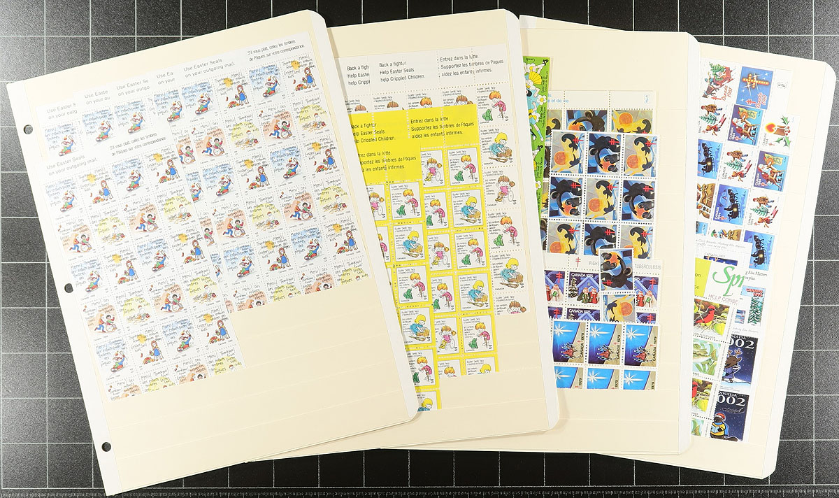 Cinderellas, labels, seals, reproductions, some revenues. All from the deepest section from the "back of the book". As diverse as it is interesting. Small enough to fit under your arm, but big enough to keep you learning for hours. We noted Lundy, various Scottish Isles, local post and express services from Canada, Great Britain and the USA, Russian Duck stamps from the early 1990's, some material from philatelic shows. A fascinating stockbook with an old time holding of "who knows what" and three mint sheet files with US/Canada TB & Easter Seals (one of the files has the panes that are stuck). The only blemish on a great lot! Estimate =