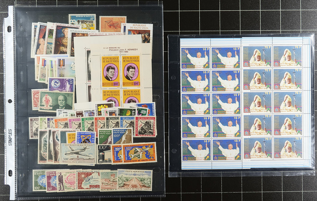 Pan-Africa mish-mash of appealing single pagers from a range of countries, with various topical appeal, and lots of catalogue value. In no particular order is Mozambique souvenir sheets from 2001-2002 (birds, dinosaurs, Egyptology, etc.), various Dahomey on "102" cards, Liberia 1979 Boy Scouts Normal Rockwell blocks, Rwanda (1973 Moths and 1990 Pope). A page of Upper Volta rounds this out. Several hundred dollars of catalogue value here, and material not often seen. Estimate =