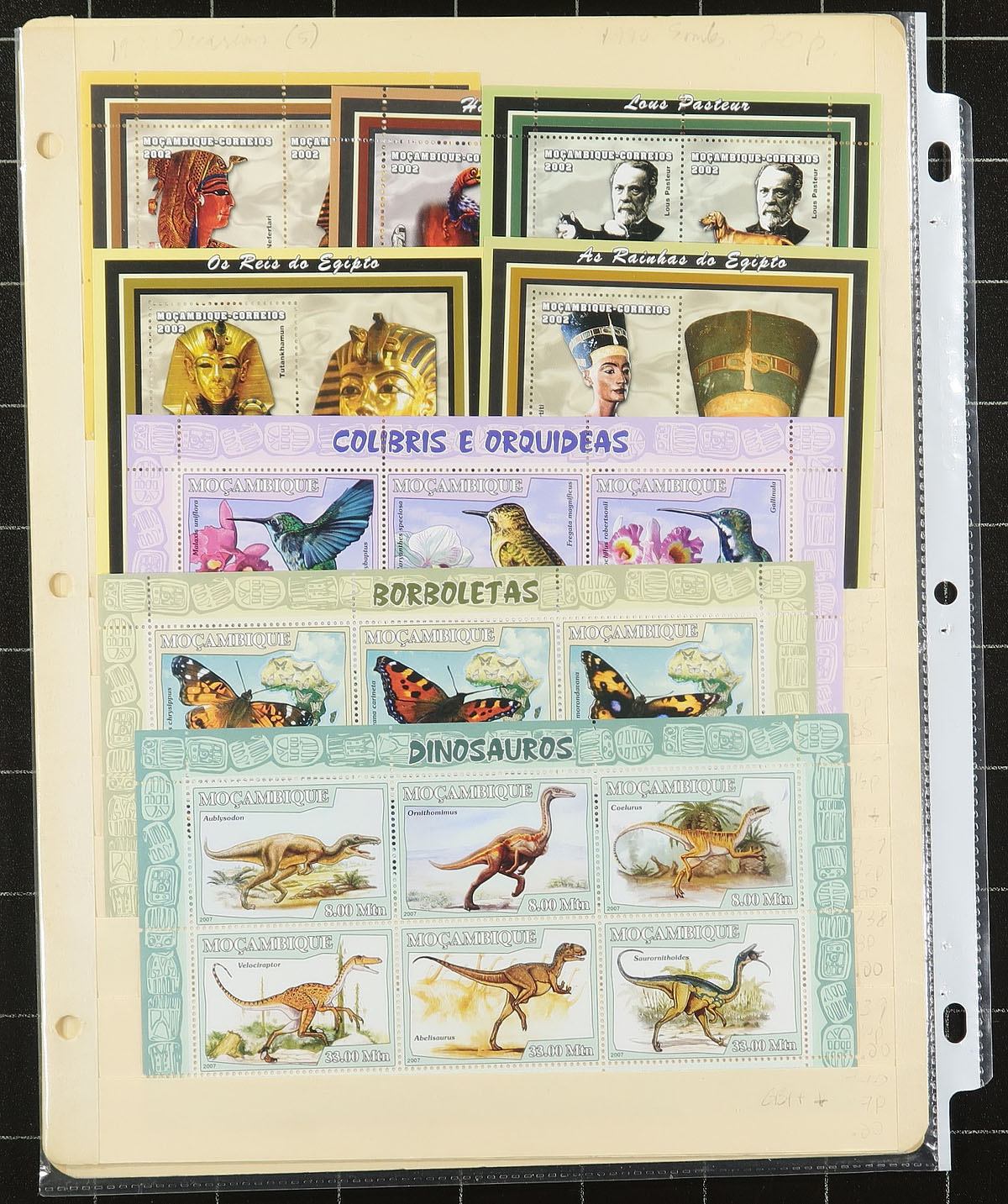 Pan-Africa mish-mash of appealing single pagers from a range of countries, with various topical appeal, and lots of catalogue value. In no particular order is Mozambique souvenir sheets from 2001-2002 (birds, dinosaurs, Egyptology, etc.), various Dahomey on "102" cards, Liberia 1979 Boy Scouts Normal Rockwell blocks, Rwanda (1973 Moths and 1990 Pope). A page of Upper Volta rounds this out. Several hundred dollars of catalogue value here, and material not often seen. Estimate =