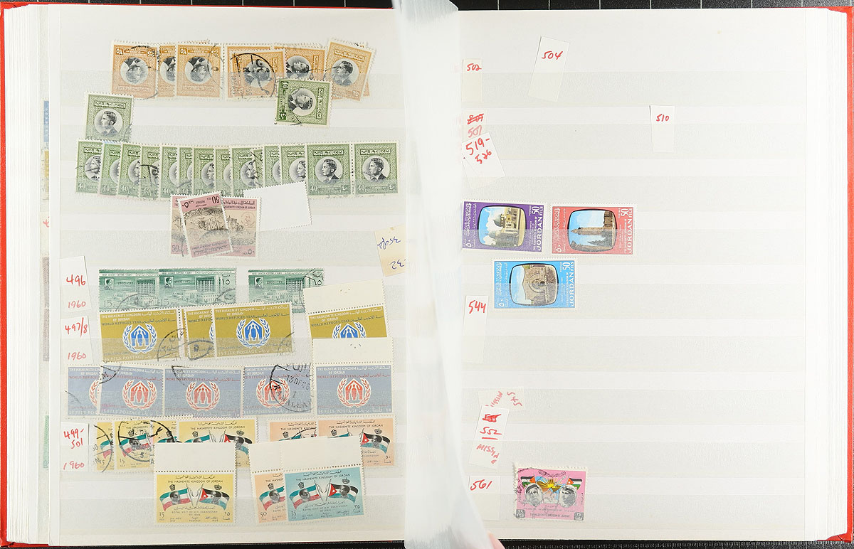 Middle East-ish selection, with a 64-page stockbook of Jordan (and a couple of pages of mint - adding another $200.00 of catalogue value), Iraq imperf airmail souvenir sheet (folded), Yemen 1983 Balloon flight, Aden (Qu’aiti & Kathiri States), Umm Al Qiwan, Fujiera, a nice set of 1949 Iran (and a partial 1960's set). Tons of catalogue value here. Not often seen. Estimate =