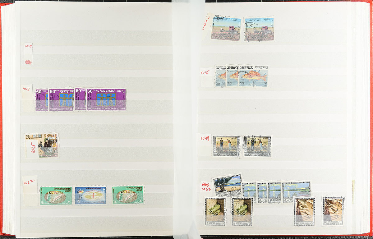 Middle East-ish selection, with a 64-page stockbook of Jordan (and a couple of pages of mint - adding another $200.00 of catalogue value), Iraq imperf airmail souvenir sheet (folded), Yemen 1983 Balloon flight, Aden (Qu’aiti & Kathiri States), Umm Al Qiwan, Fujiera, a nice set of 1949 Iran (and a partial 1960's set). Tons of catalogue value here. Not often seen. Estimate =