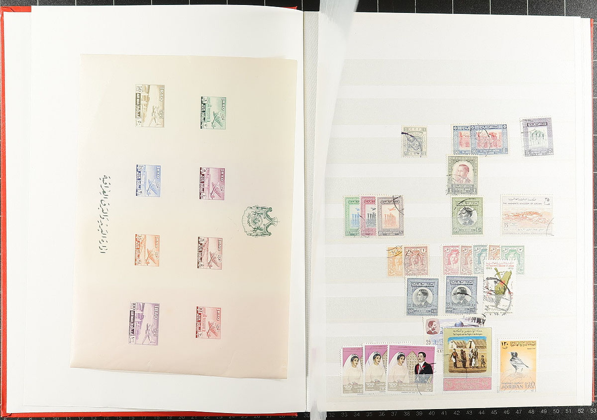 Middle East-ish selection, with a 64-page stockbook of Jordan (and a couple of pages of mint - adding another $200.00 of catalogue value), Iraq imperf airmail souvenir sheet (folded), Yemen 1983 Balloon flight, Aden (Qu’aiti & Kathiri States), Umm Al Qiwan, Fujiera, a nice set of 1949 Iran (and a partial 1960's set). Tons of catalogue value here. Not often seen. Estimate =