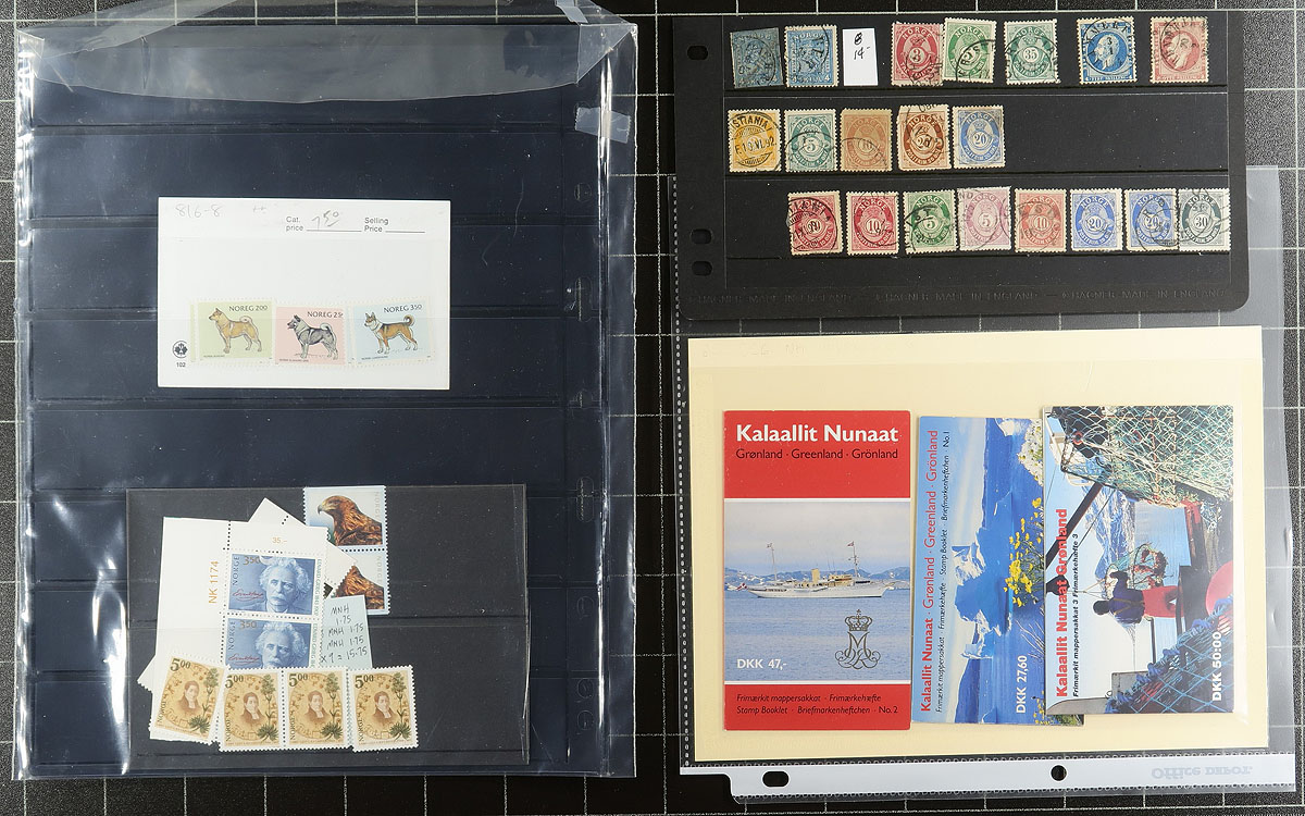 Scandinavian Smorgasbord #1: The balance of an estate with a wide assortment of material. Norway has some early used #3, #4 (and very modern) issues, 1970's-1980's booklets. Denmark has nice pages of 1960's-1970's issues with corner singles, with margin numbers and a lightly hinged copy of #139 and a century’s worth of mint from 1884 (almost 100 stamps, almost 100 years). Greenland booklets from ca1990 are complemented with a couple of pages of used sets and singles. Finally, there is an old circuit book (price in DM) mostly Denmark, Sweden and Denmark. Lots of catalogue value here. Estimate =