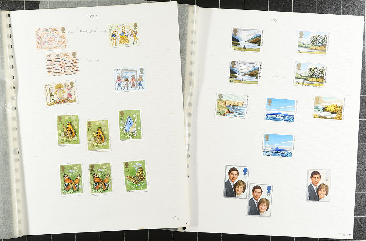 Hingeless Lindner album duo. Includes the classic "1840-1951" edition (to the end of King George VI), plus a second volume of 1981-1985 in near-new condition. Each in a dark blue 18-ring binder with matching slip case (one could use some minor regluing. The first volume and the second binder with slip cases retail at over €200.00. BUT there are no stamps inside, so the consignor is sweetening the deal by adding a couple of thousand dollars (catalogue value) of mostly used stamps suitable for both albums. Estimate =