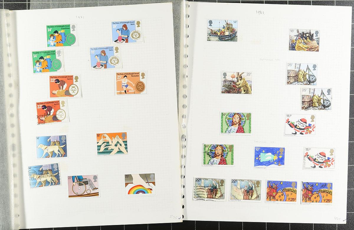 Hingeless Lindner album duo. Includes the classic "1840-1951" edition (to the end of King George VI), plus a second volume of 1981-1985 in near-new condition. Each in a dark blue 18-ring binder with matching slip case (one could use some minor regluing. The first volume and the second binder with slip cases retail at over €200.00. BUT there are no stamps inside, so the consignor is sweetening the deal by adding a couple of thousand dollars (catalogue value) of mostly used stamps suitable for both albums. Estimate =