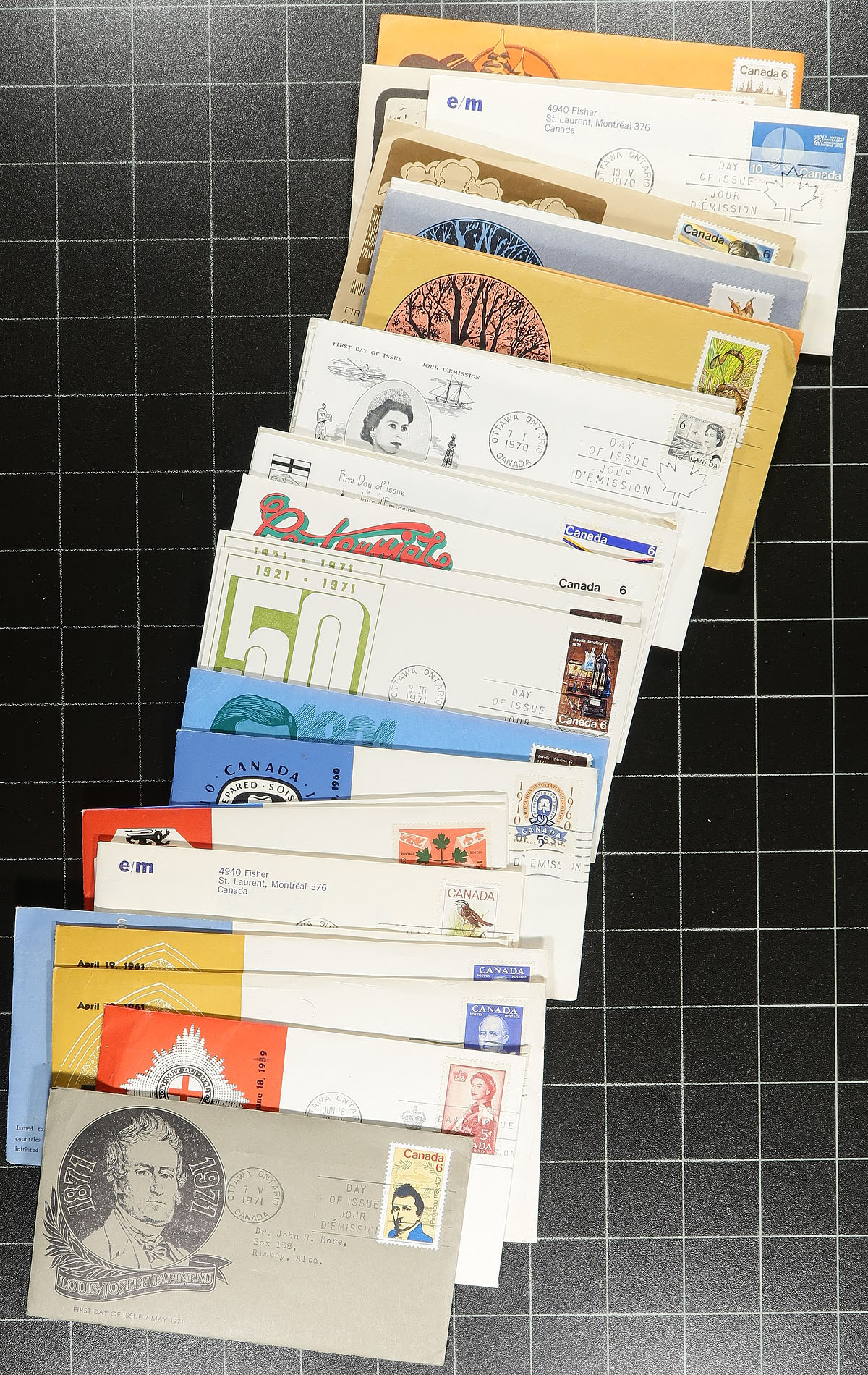 First Day Covers. Private cachet First Day Covers, several hundred of them, mostly different. A number are "drug" company, including lots of Schering (1957-1974), in a wide variety of sizes, most with the original contents and the last four years often with the unusual franking of plate blocks. There are some 1978 Colorano "Silk" cachets, 1977-79 "House of Commons" usages, an interesting stud of 22 different cachets on the 1964 "Quebec Conference", plus some 1960's "Rosecraft" cachets mounted on pages (often with mint stamps accompanying). Not your usual batch. Estimate =
