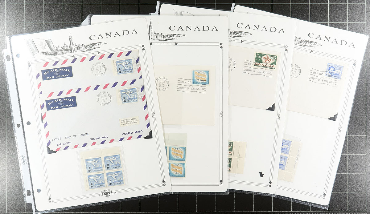 First Day Covers. Private cachet First Day Covers, several hundred of them, mostly different. A number are "drug" company, including lots of Schering (1957-1974), in a wide variety of sizes, most with the original contents and the last four years often with the unusual franking of plate blocks. There are some 1978 Colorano "Silk" cachets, 1977-79 "House of Commons" usages, an interesting stud of 22 different cachets on the 1964 "Quebec Conference", plus some 1960's "Rosecraft" cachets mounted on pages (often with mint stamps accompanying). Not your usual batch. Estimate =